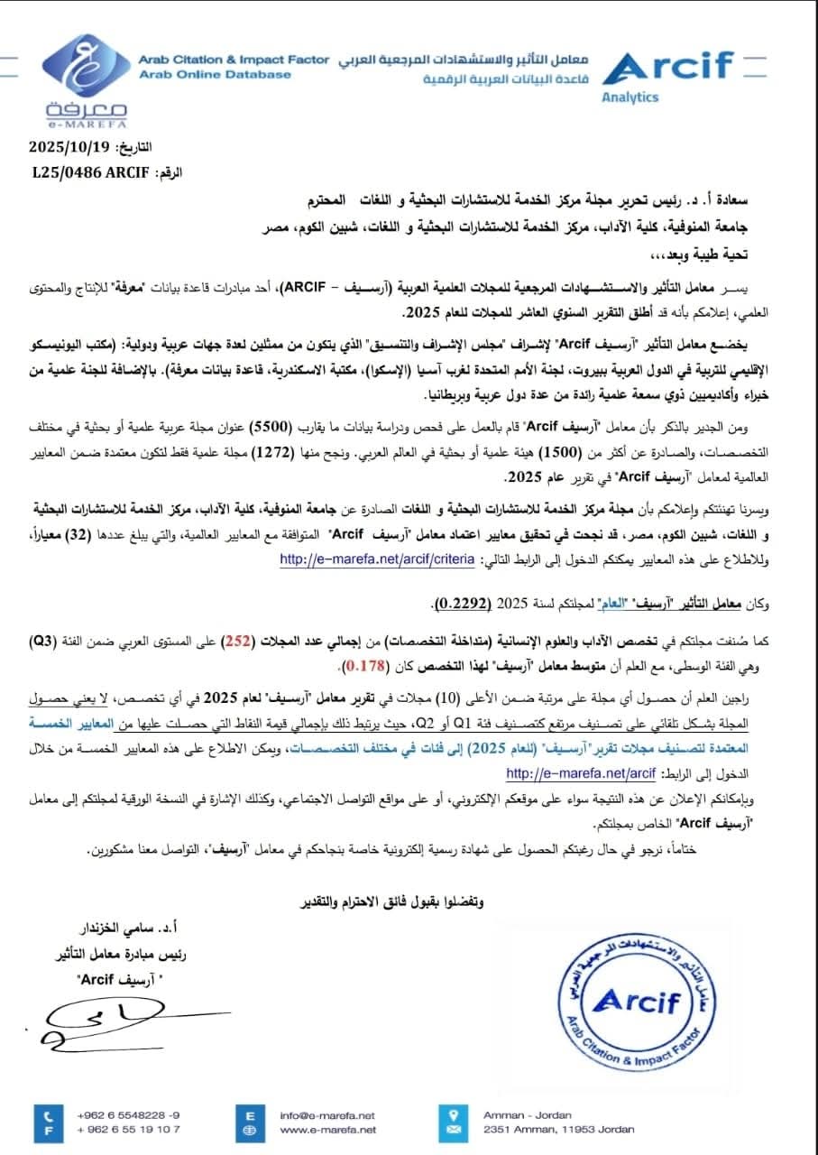 باسم السادة أعضاء هيئة التدريس والهيئة المعاونة والجهاز الإدارى والعاملون والطلاب، يتقدم الأستاذ الدكتور/خالد زيادة عميد كلية الآداب، بخالص التهنئات والتبريكات لجميع منسوبى جامعة المنوفية، وكلية الآداب، بمناسبة نجاح" مجلة مركز الخدمة للإستشارات البحثية واللغات" بكلية الآداب جامعة المنوفية، في تحقيق معايير إعتماد معامل ( أرسيف ARCIF )، المتوافقة مع المعايير العالمية والتي يبلغ عددها (32) معيار، حيث صنفت المجلة ضمن الفئة ( Q3 ) على المستوى العربي.