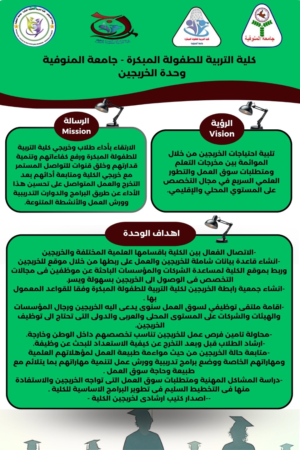 الارتقاء بأداء طلاب وخريجي كلية التربية للطفولة المبكرة ورفع كفاءاتهم وتنمية قدارتهم وخلق قنوات للتواصل المستمر مع خريجي الكلية ومتابعة أدائهم بعد التخرج والعمل المتواصل على تحسين هذا الأداء عن طريق البرامج والدوارت التدريبية وورش العمل والأنشطة المتنوعة.