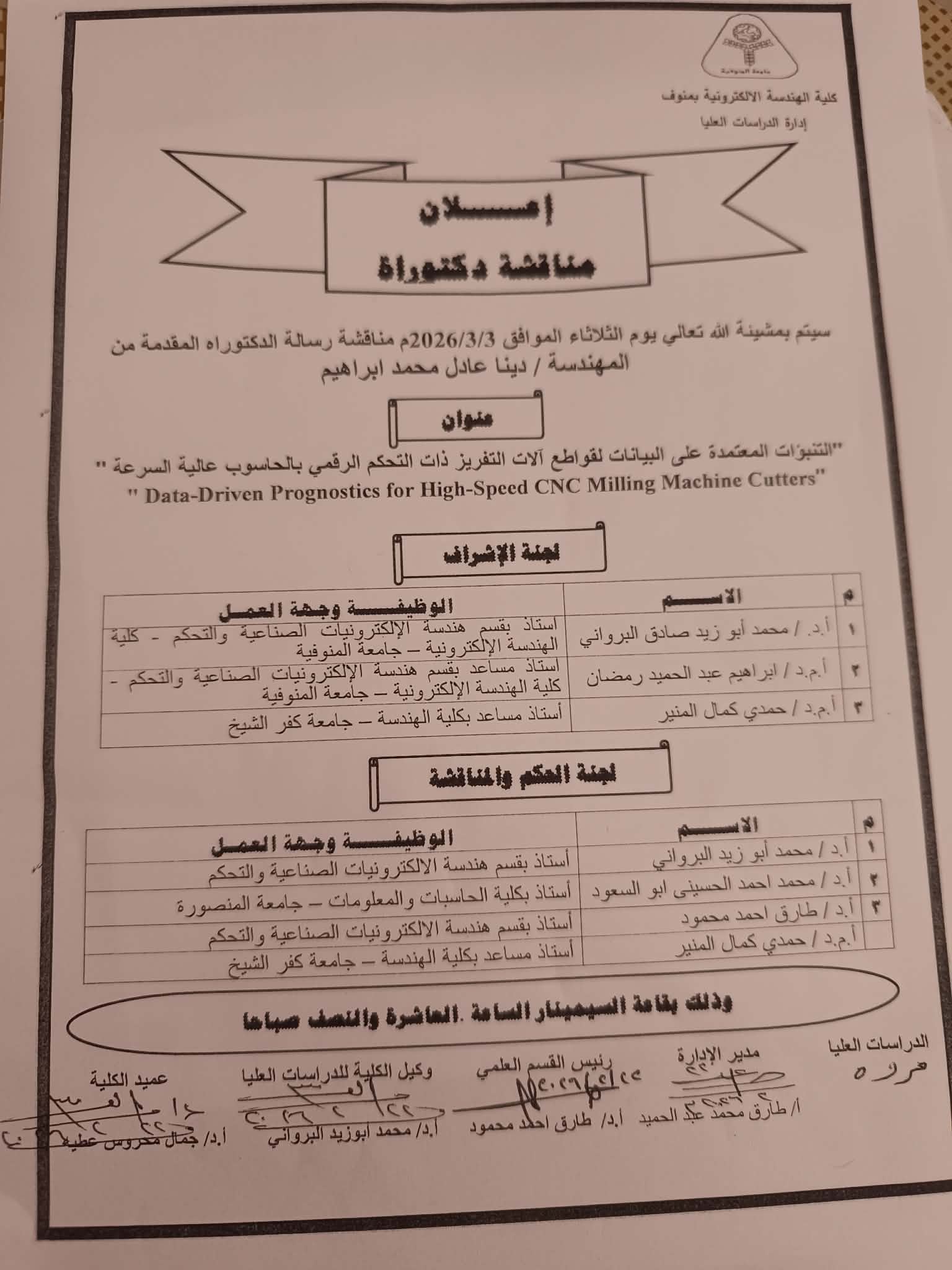 مناقشة مناقشة رسالة الدكتوراه المقدمة من المهندسة / دينا عادل محمد إبراهيم