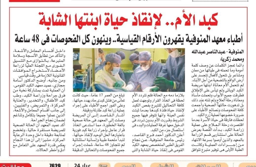 شهد معهد الكبد القومي بجامعة المنوفية "أمسية جراحية" استثنائية، تضاف إلى سجل إنجازاته الطبية، حيث نجح الفريق الطبي في إج