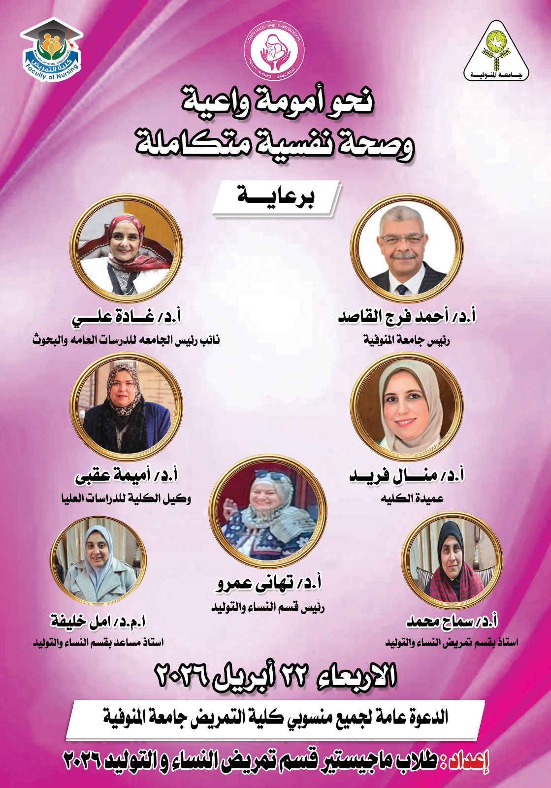 تشرف قسم النساء والتوليد بدعوة سيادتكم لحضور فعالية "امومة واعية وصحة نفسية متكاملة"