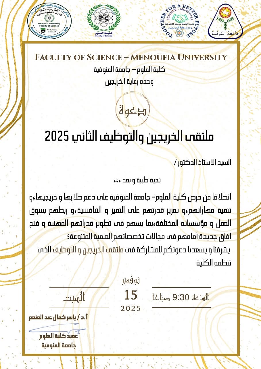 🎓 كلية العلوم – جامعة المنوفية تتشرف بدعوتكم للمشاركة في ملتقى الخريجين والتوظيف الثاني 20