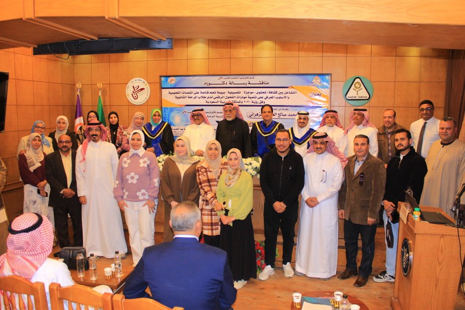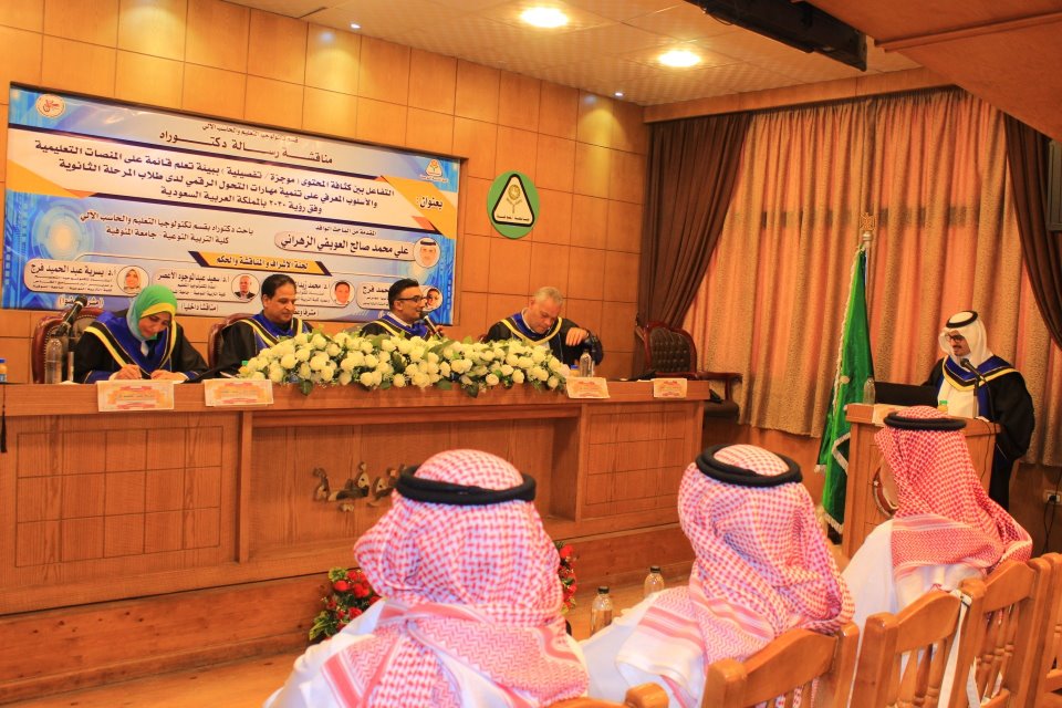 للباحث/ علي بن محمد العويفي الزهراني لحصوله على درجة الدكتوراة في تخصص تكنولوجيا التعليم بتقدير ممتاز مع التوصية بطباعتها وتبادلها بين الجامعات العربية والمراكز البحثية في كل من مصر والسعودية، داعين الله أن يوفقه إلى المزيد من التميز والإنجاز، وخالص التمنيات بدوام النجاح والتقدم والتوفيق في مهام عمله.