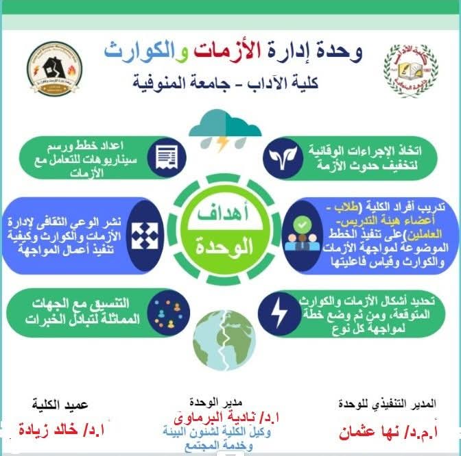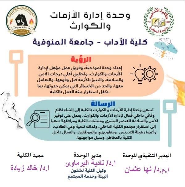 وحدة الأزمات والكوارث 1_ الهيكل التنظيمى لوحدة إدارة الأزمات والكوارث بكلية الآداب جامعة المنوفية 2_ رؤية ورسالة وحدة إدارة الأزمات والكوارث بكلية الآداب جامعة المنوفية 3_ أهداف وحدة إدارة الأزمات والكوارث بكلية الآداب جامعة المنوفية Share