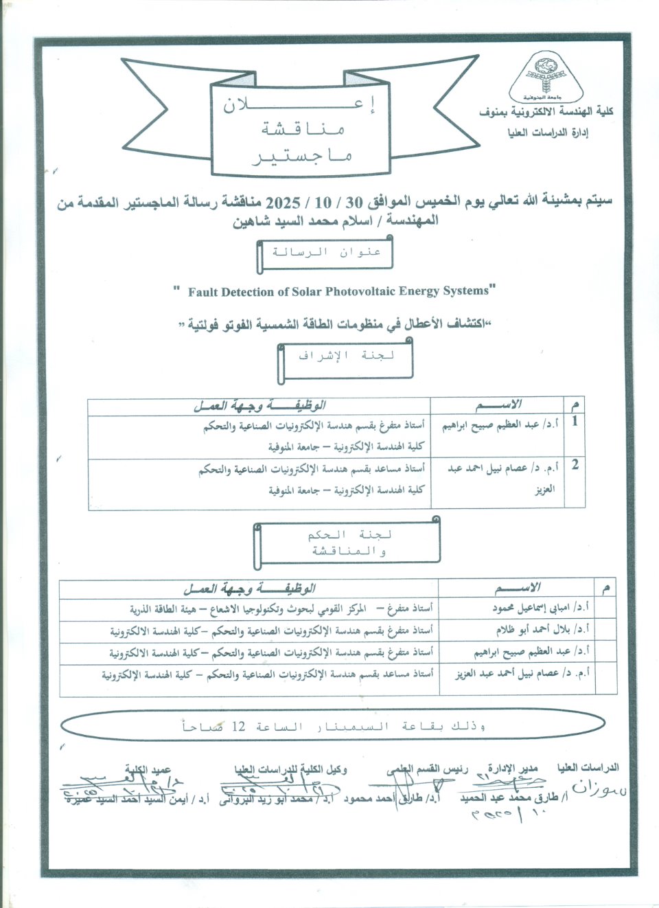 اعلان مناقشة رسالة الماجستير للمهندسه/اسلام محمد السيد شاهين بعنوان (اكتشاف الاعطال فى منظومات الطاقه الشمسيه الفوتوفولتيه)