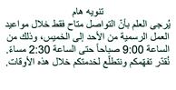 تنوية هام يرجى العلم بأن التواصل متاح فقط خلال مواعيد العمل الرسمية من الاحد الى الخميس ، وذلك من الساعة 9:00 صباحا حتى الساعة 2:30 مساء. نُقدر تفهمكم ونتطلع لخدمتكم خلال هذه الاوقات.. إدارة المركز